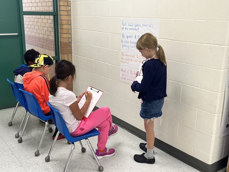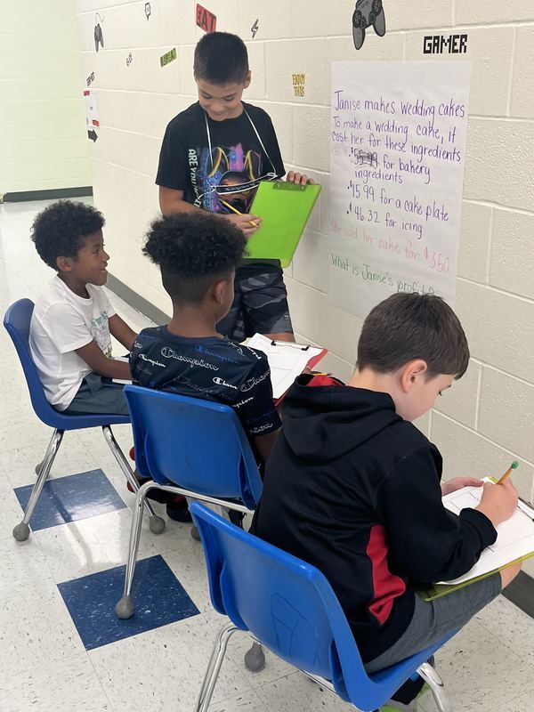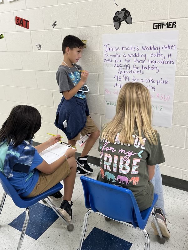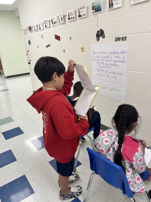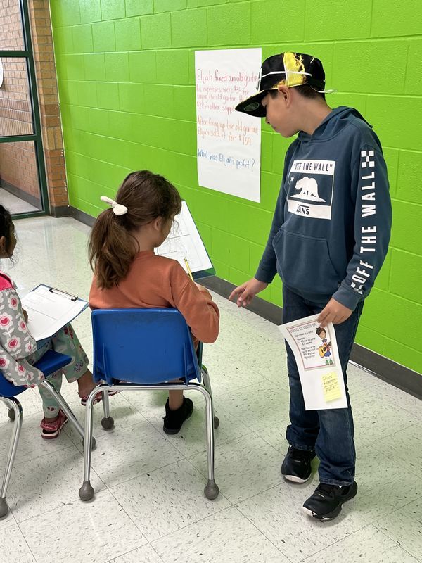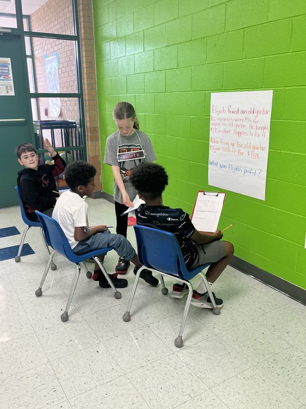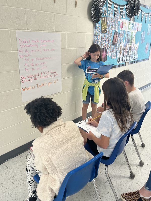 A group of students in each of Mrs. Dimock's 4th grade math blocks were trained by Mrs. Dimock on how to find profit. Each expert was assigned a profit situation and had to solve it in order to be considered for the expert position. After the experts were trained, students divided up into four groups. The expert students had the task of reading the situation, talking about the vocabulary, and the process for finding profit. Then the students went to work solving the profit problem. The students would check in with their expert student teacher for each step of the process before moving onto the next step. The experts guided students with questions like: What should you do next? Do you think that would work? At the end of the activity, the class came back together with the teacher to share feedback and give a summary of what they learned in the expert groups. The experts were TIRED and reported back to Mrs. Dimock that teaching is HARD! The class wrapped up for the day with an exit ticket about profit that was completed individually.